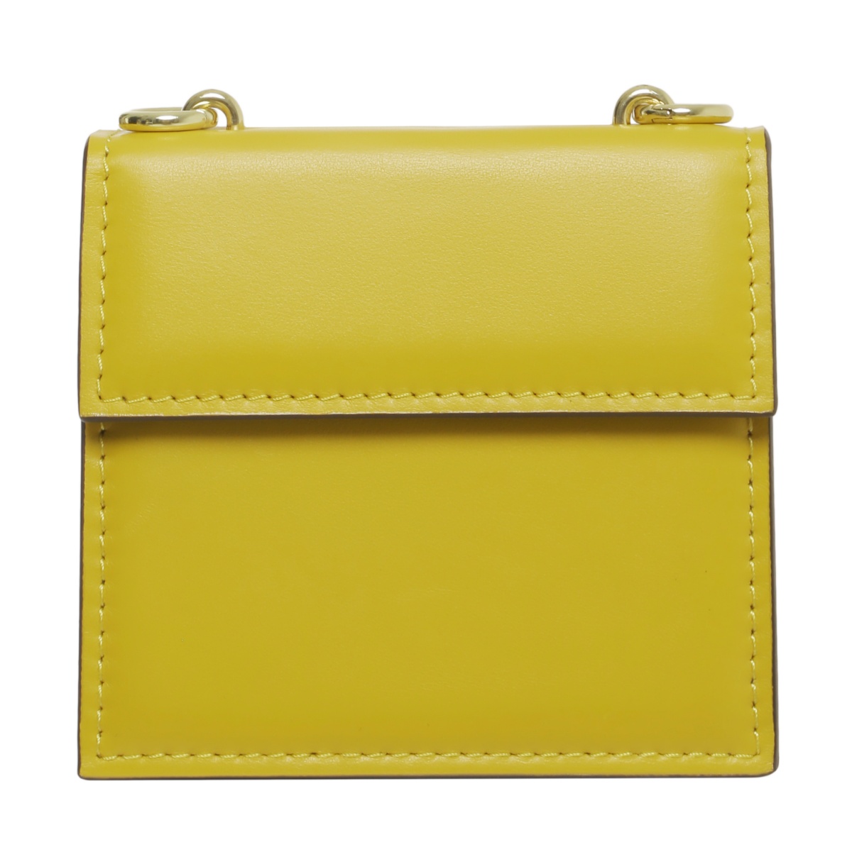 Square shape flap purse in yellow supple leather with removable strap and gold hardware.